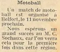C’est en 1930 que le tout premier match d’exhibition de motoball voit le jour. Plus précisément le 11 novembre 1930, à Belfort, comme le rapporte la revue spécialisée Moto Revue (n°398).