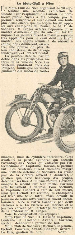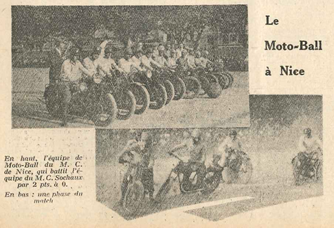 Toujours selon Moto Revue (n°447), c’est dans le sud de la France qu’apparaît le deuxième club de motoball, à Nice. Le second match d’exhibition, organisé le 20 septembre 1931 sur l’esplanade du Pavillon, confirme l’intérêt croissant pour cette nouvelle discipline. La rencontre oppose les Niçois aux joueurs du Moto-Club de Sochaux dans une ambiance particulièrement animée.